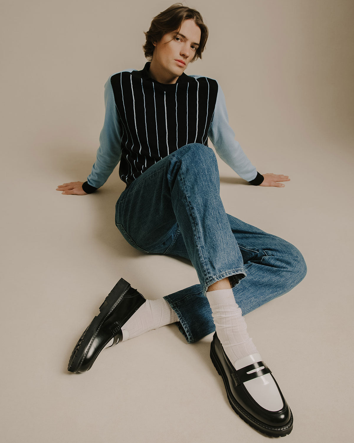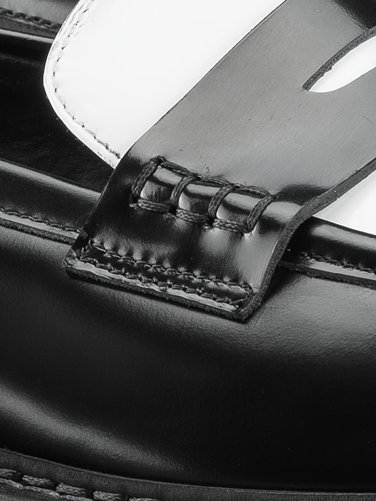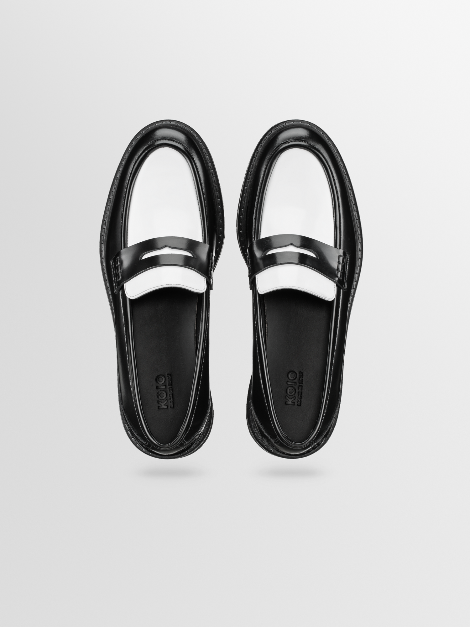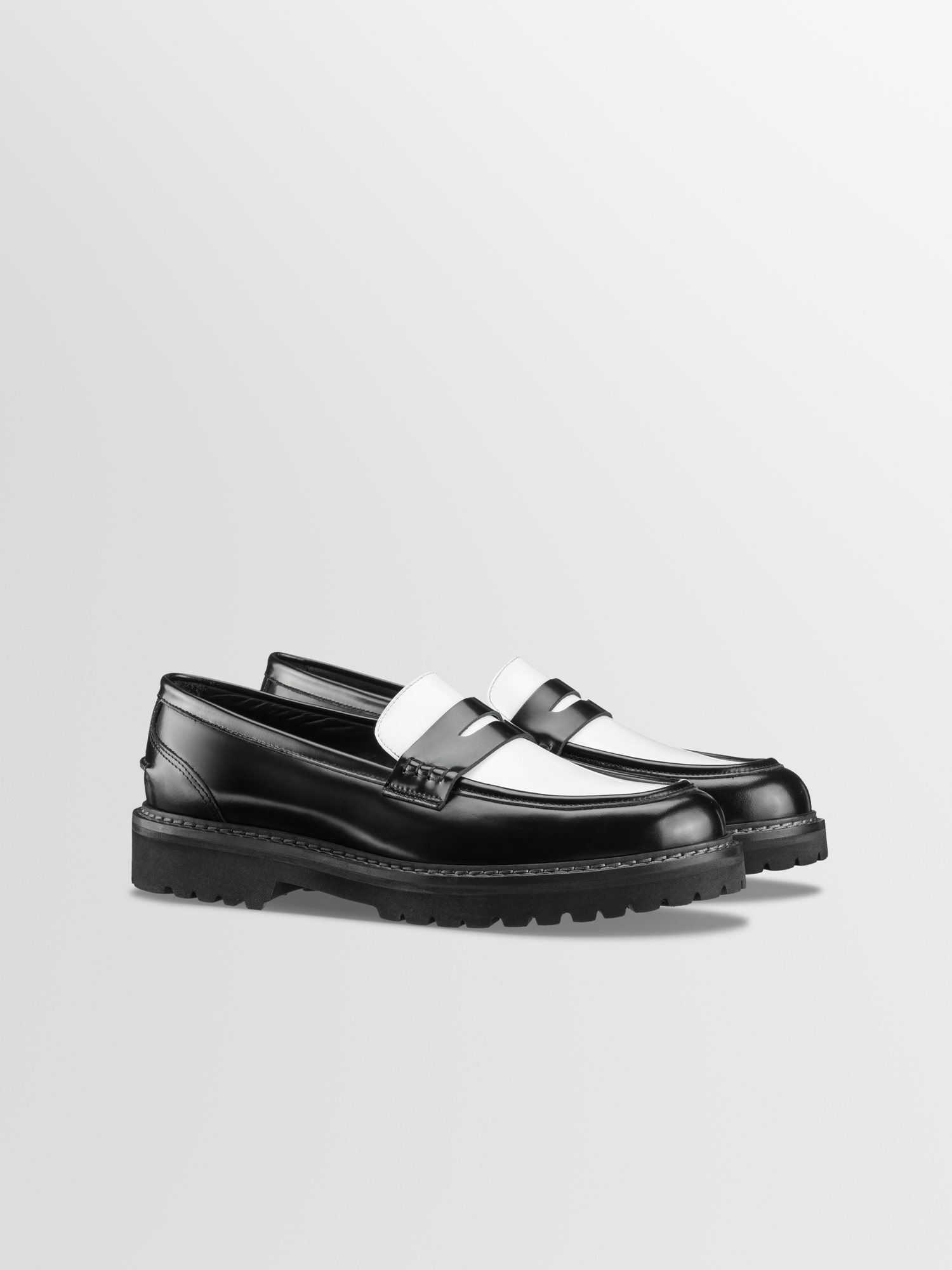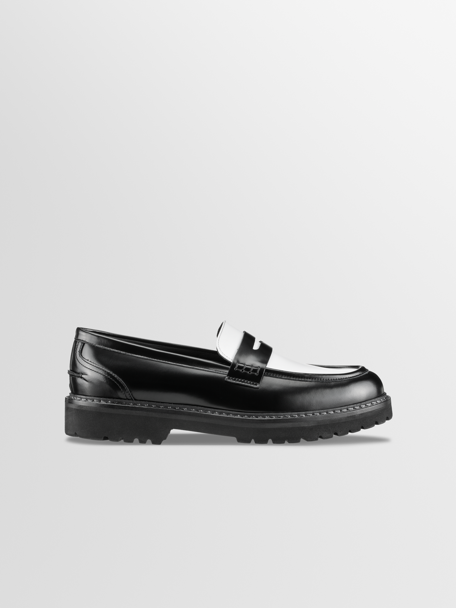 The Arezzo's chunky lug sole lends the classic loafer silhouette a cool, bold look. Handcrafted in Italy from smooth black and white Italian leather, this Dice pair has a penny slot at the vamp and exposed hand-stitching along the collar.
