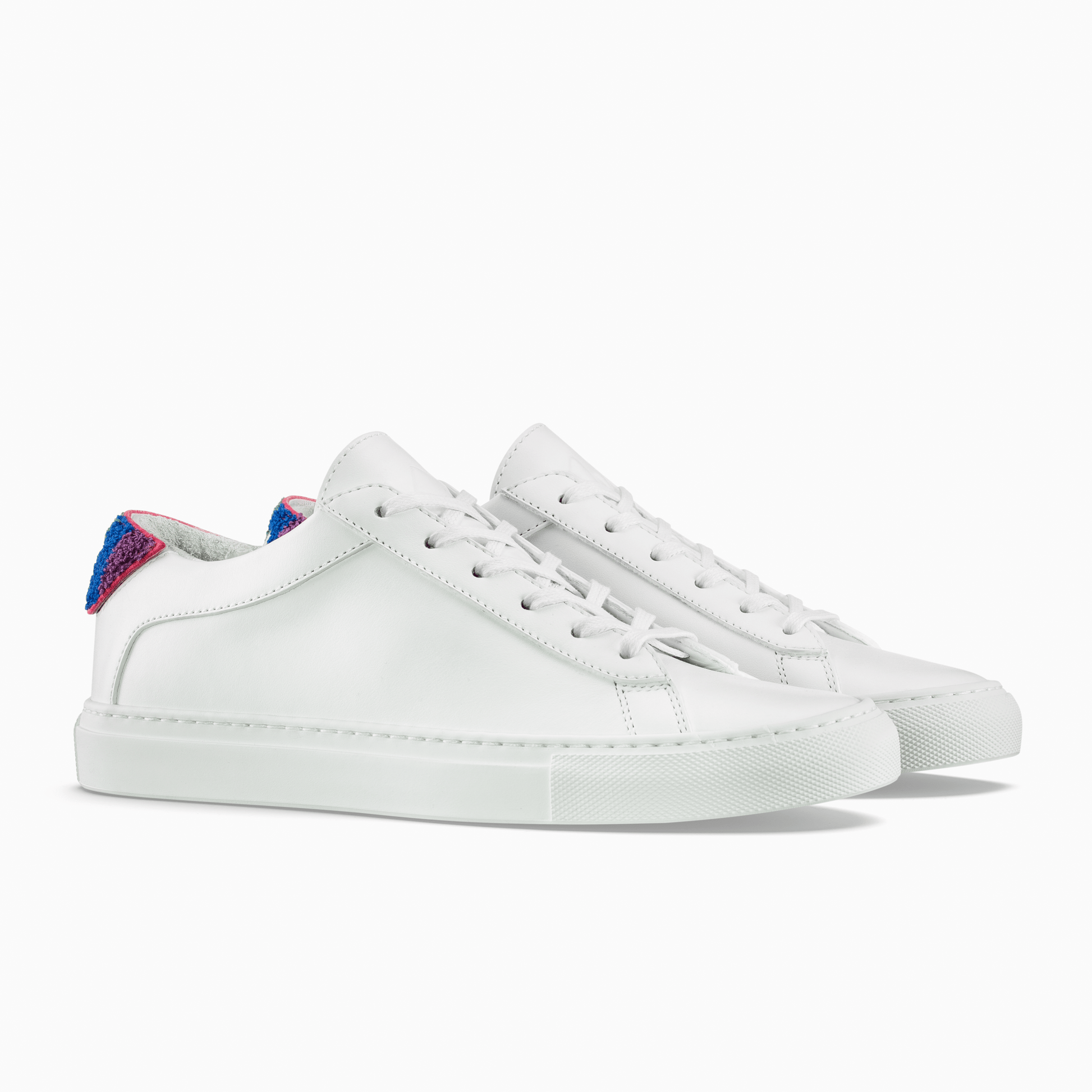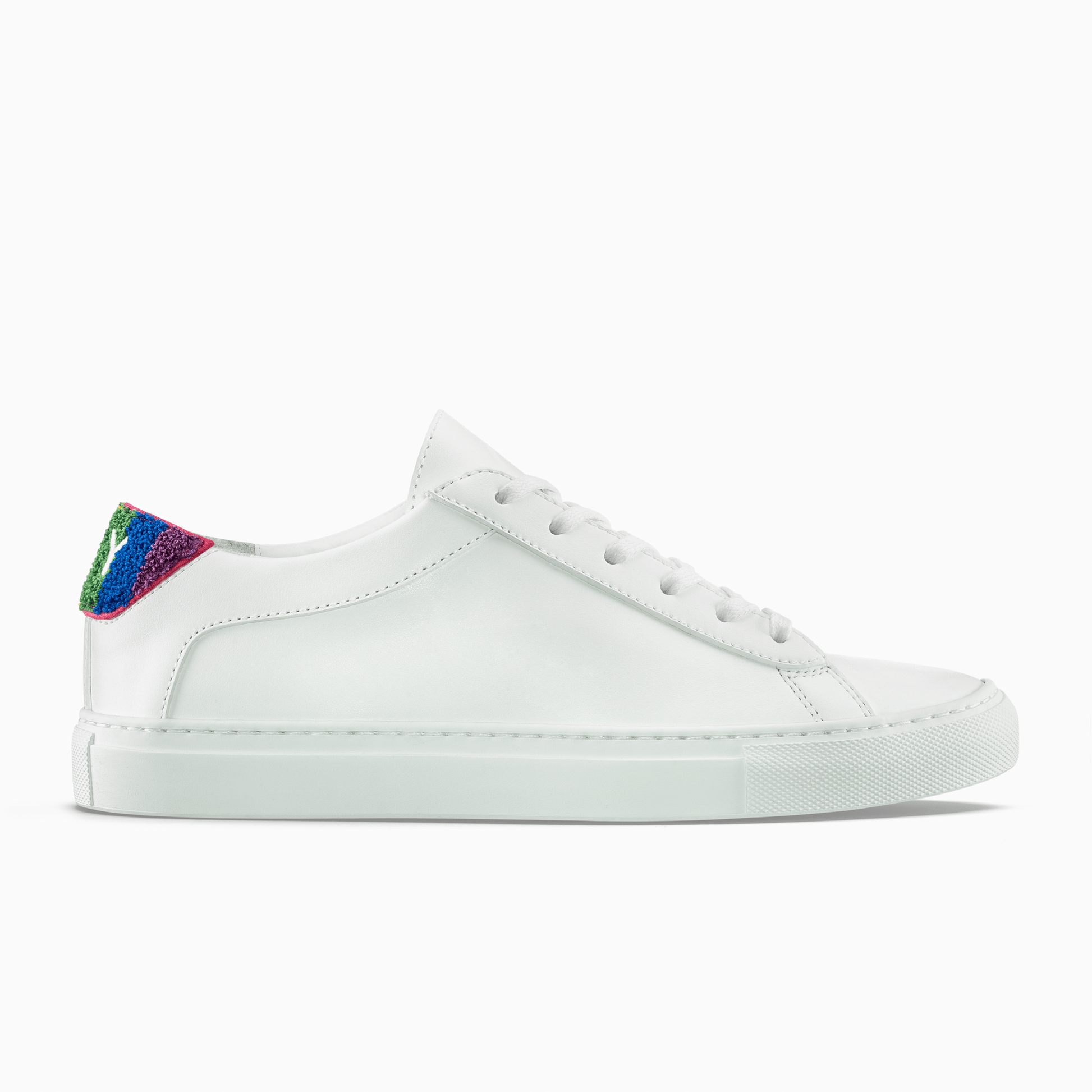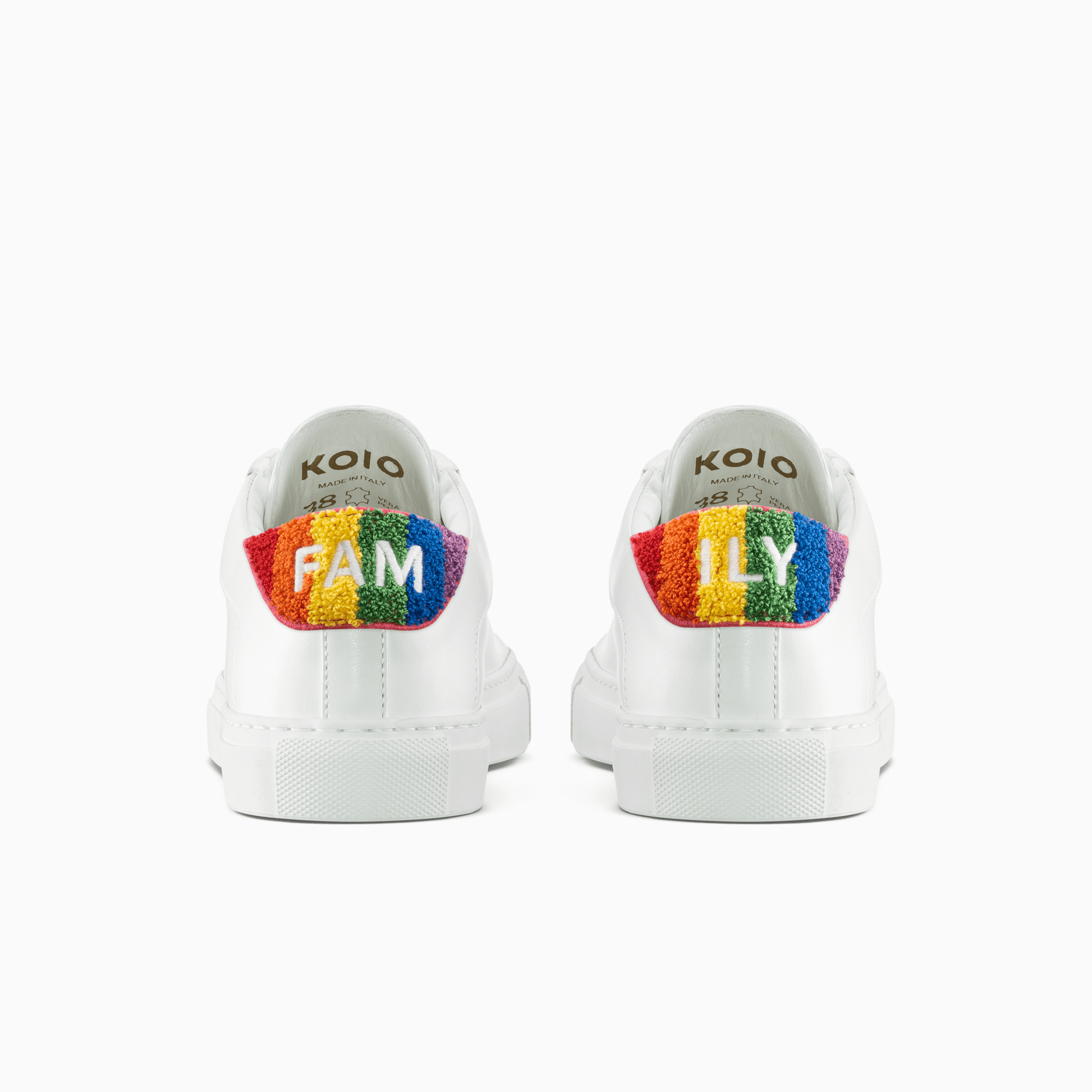The Capri in ‘Pride’ is a celebration of the LGBTQ+ community. Handcrafted from smooth Italian leather and set on a durable rubber sole, it comes with three sets of VELCRO®-fastening heel patches featuring the letters ‘FAM’ and ‘ILY’—attach a matching pair, mix and match two different ones, or remove them entirely to reveal an embroidered logo: