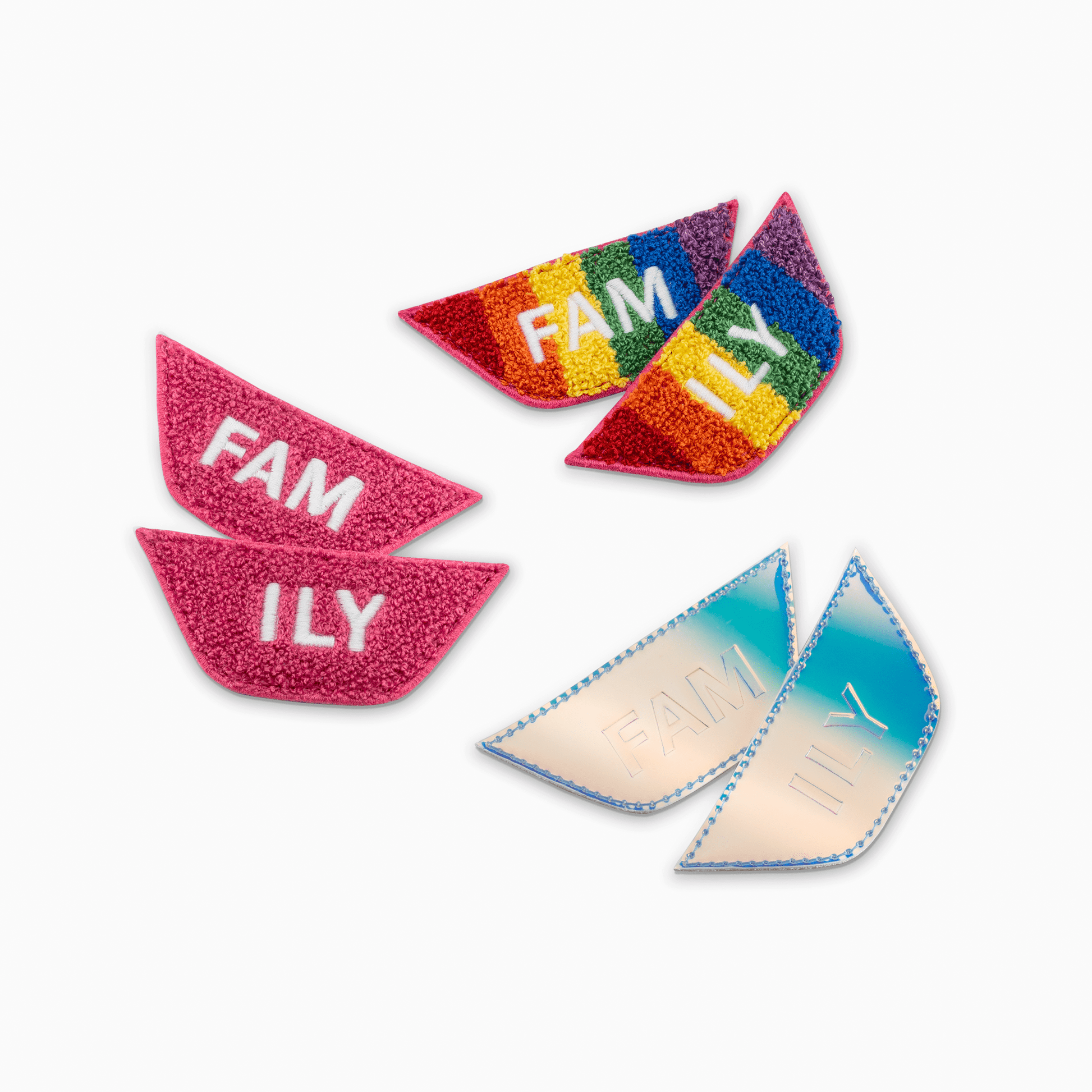 Two debossed patches that are coated with an iridescent finish, so they glimmer with every color of the rainbow as you move