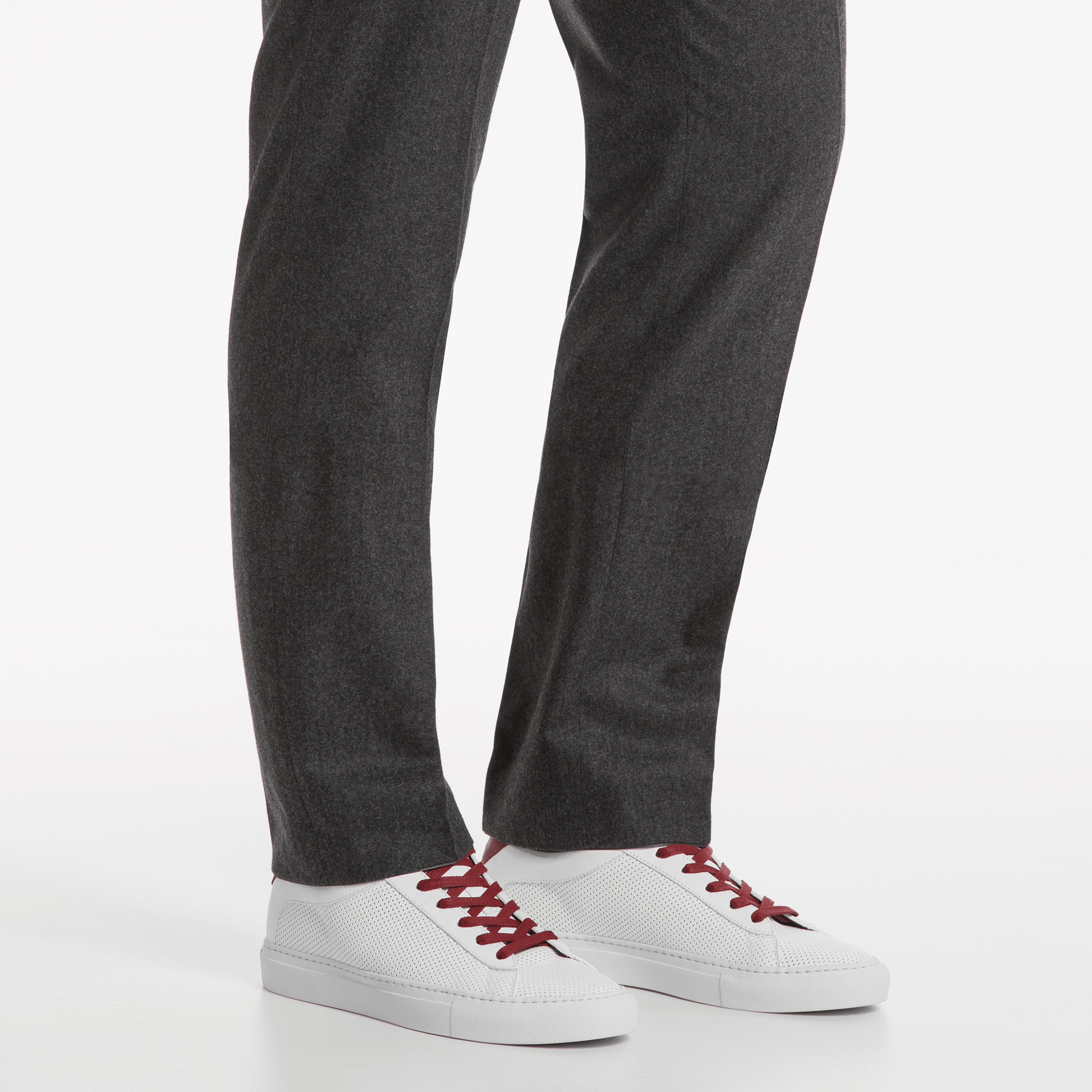 A sporty take on the Capri, with perforated premium Vitello leather for maximum breathability. Luxury materials combine with enhanced comfort to make this shoe a warmer month essential. The Perforated Capri comes in a classic white color way, with hints of red on the heel tab and laces.
