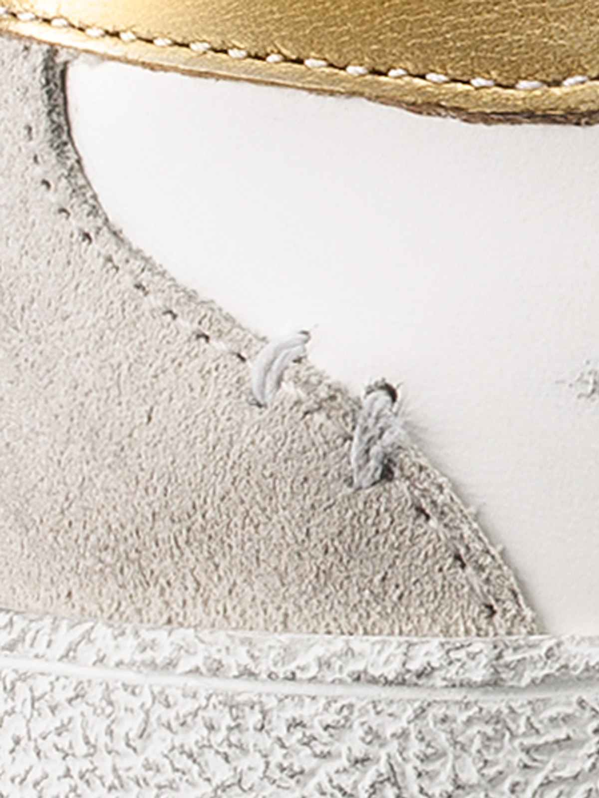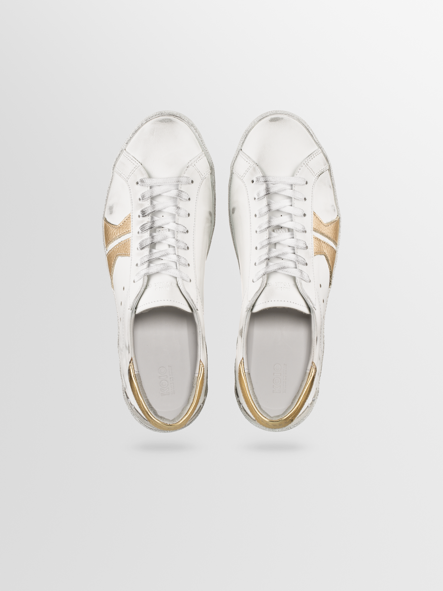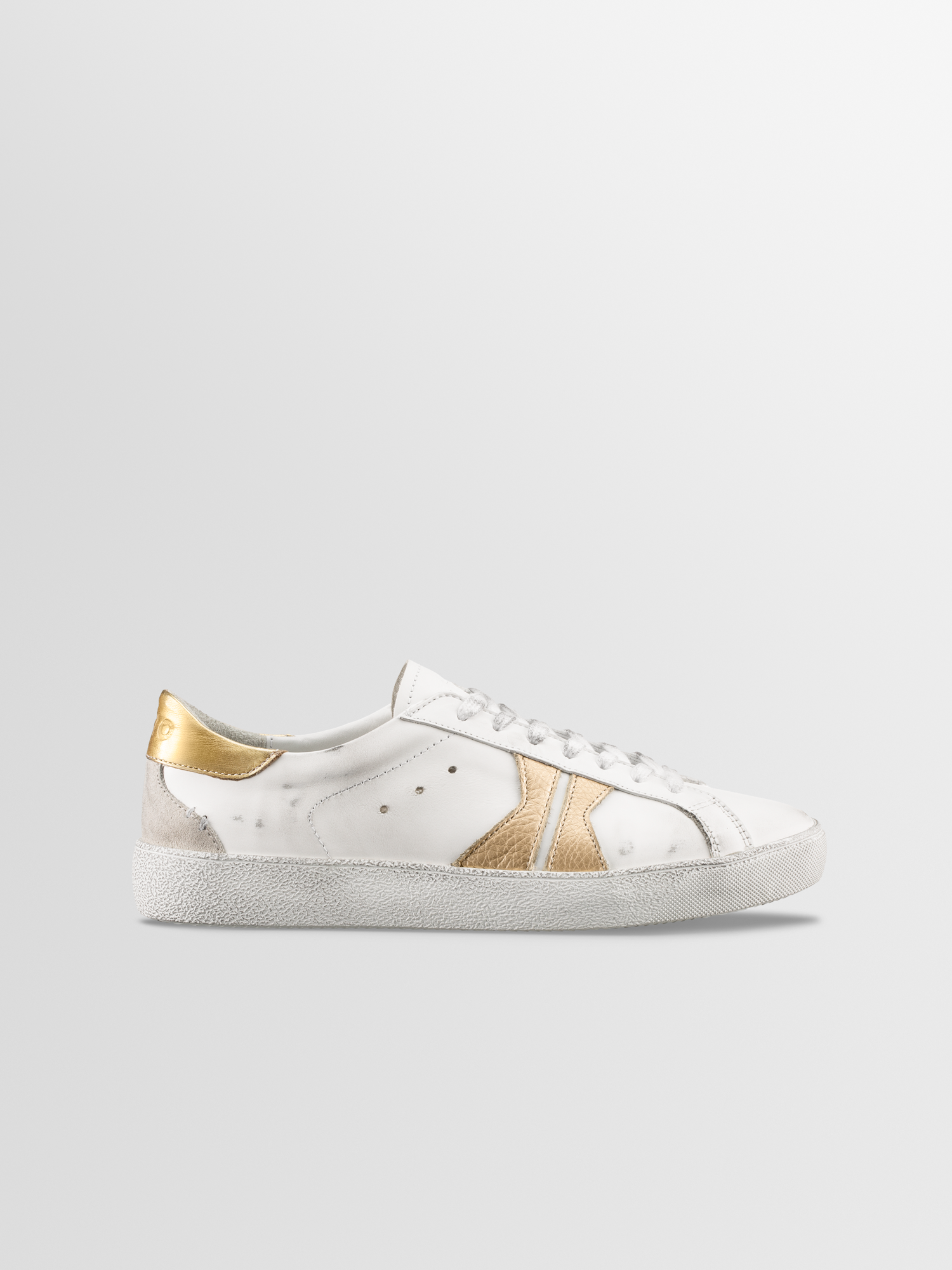 The Fabro sneaker is hand-distressed, so each pair has a uniquely authentic vintage look. Shown here in a white, grey, and gold Hollywood colorway, this pair is handcrafted in Italy from Italian leather and suede. It's detailed with our signature K logo at the side and finished with hand-stitching at the heel. The breathable cotton-terry lining keeps you cool and comfortable.