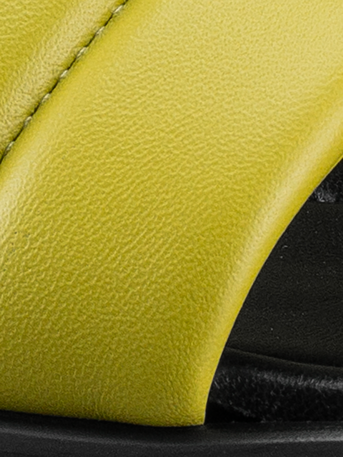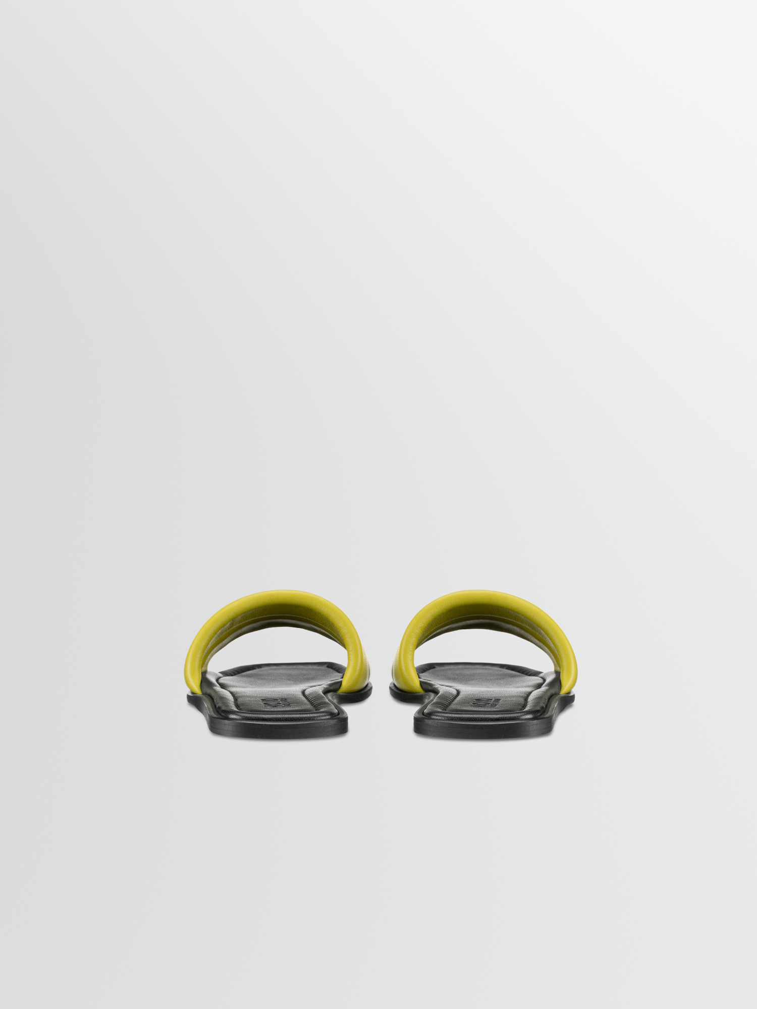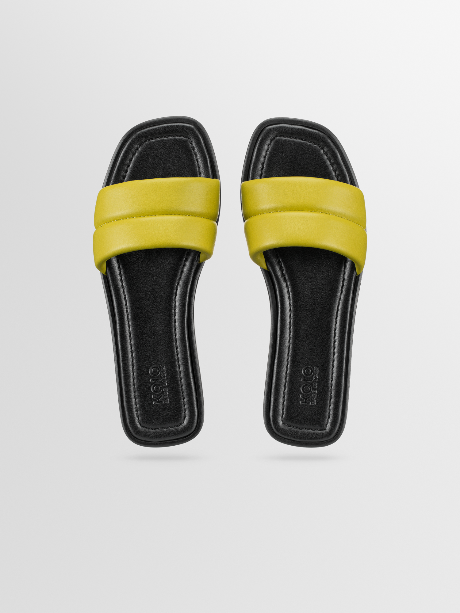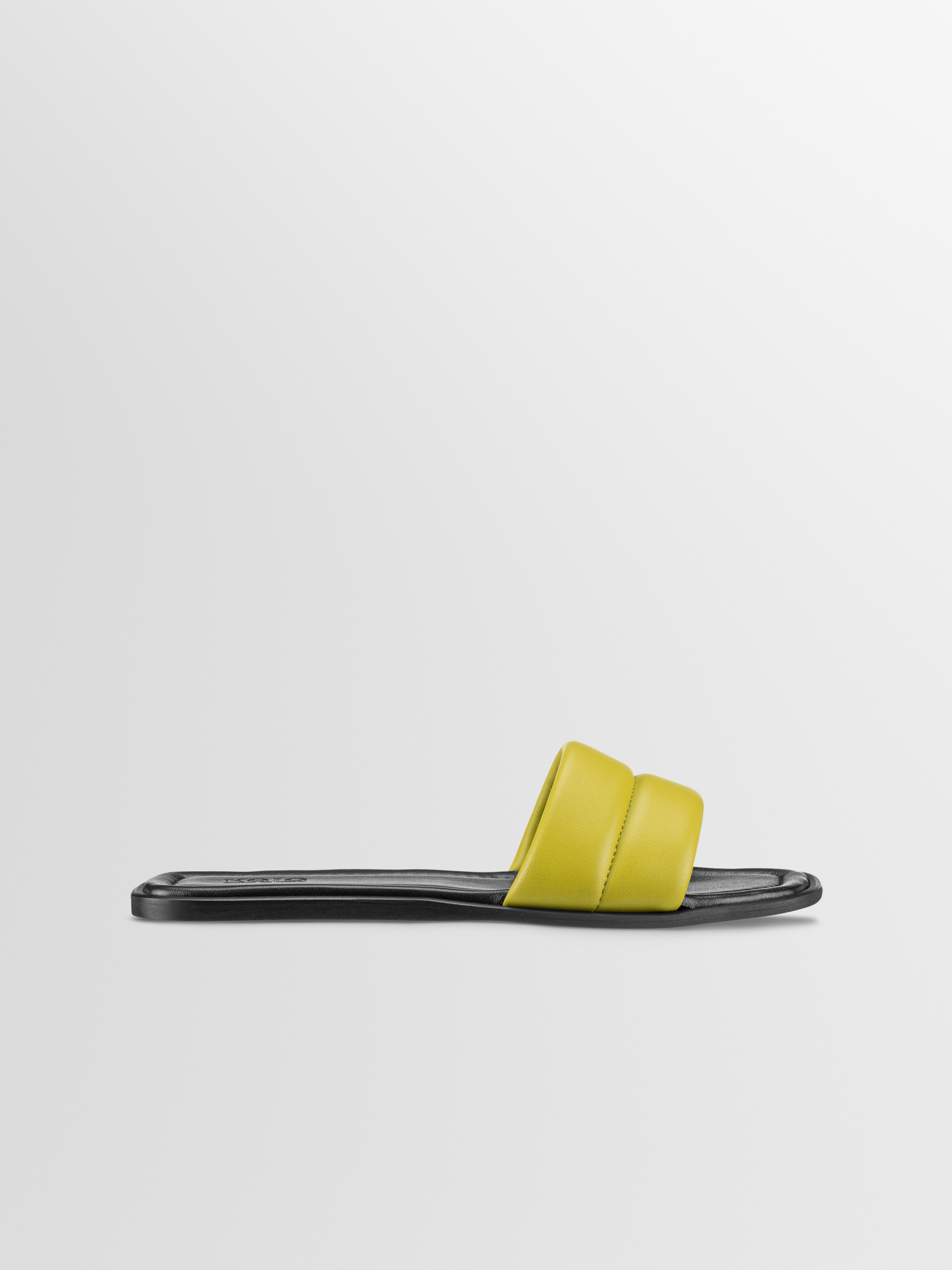 The Poppi mule is elegant yet comfortable, making it perfect for everyday wear during the warmer months. Shown here in vivid Citron Italian leather, it has a comfortable padded strap and flat square-toe silhouette with a cushioned insole.
