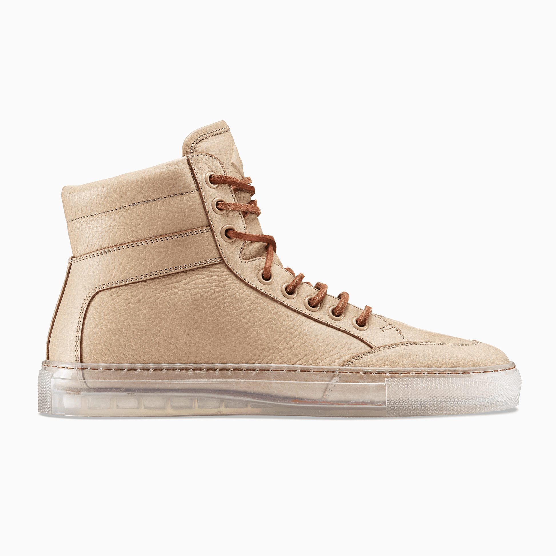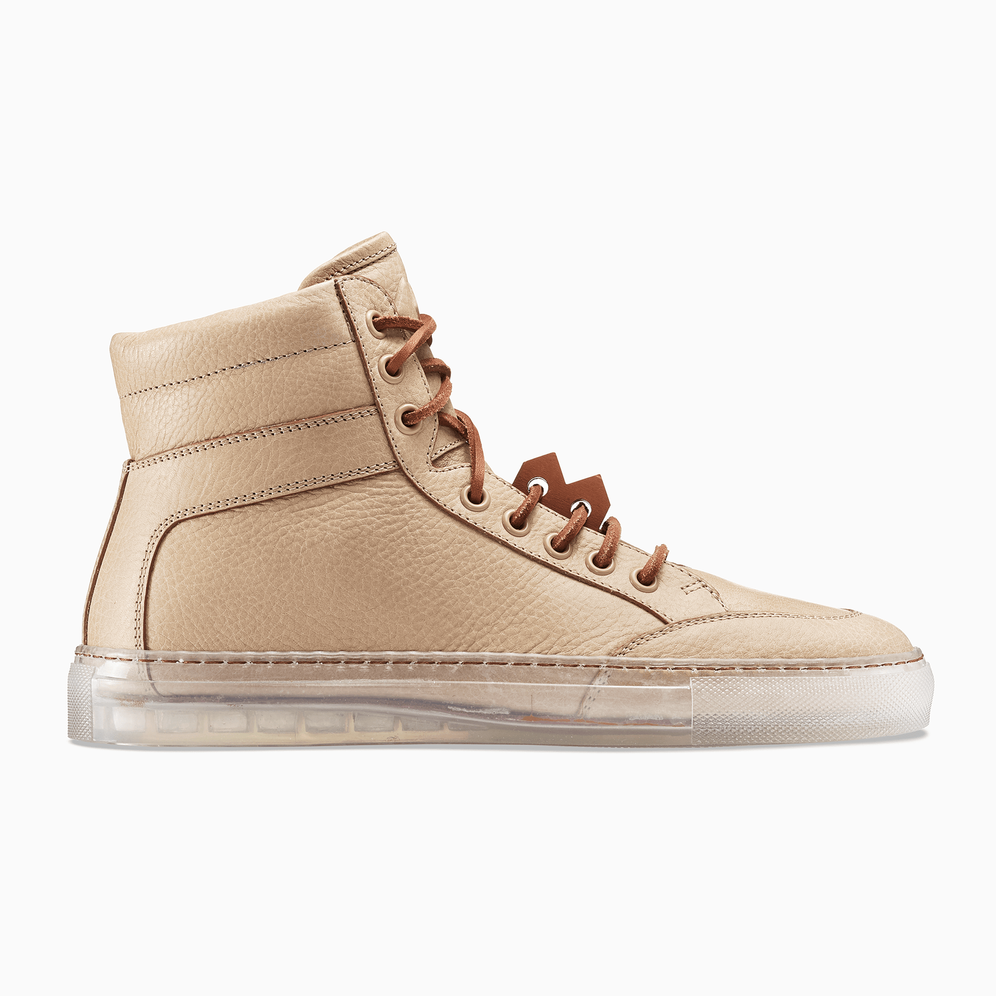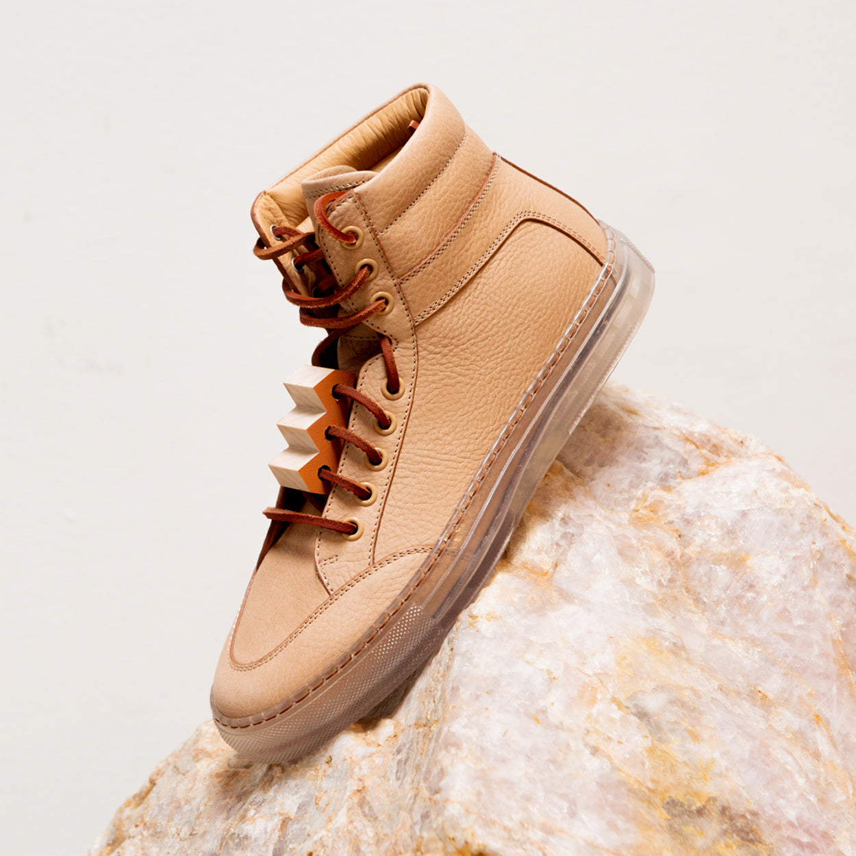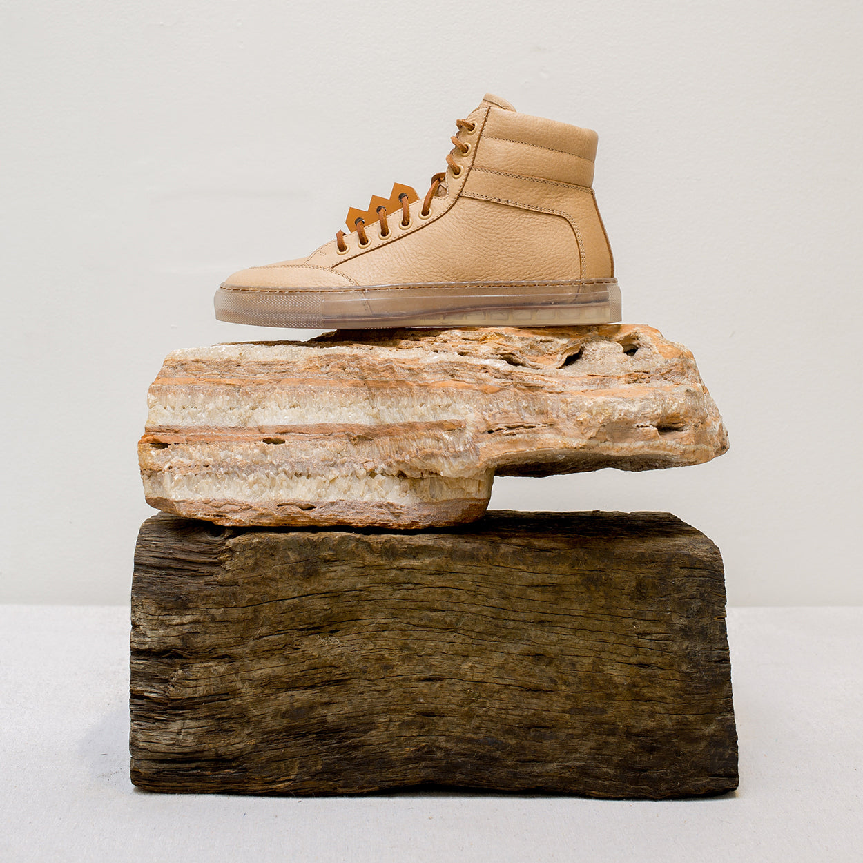 The Koio x Bradley Duncan is a collaboration with the L.A.-based sculpture artist. Bradley is renowned for his simplified geometric forms crafted from organic materials. His refined expressions demonstrate the enormous strength of both minimalist tradition and time-honored craftsmanship. In a similar vein is the Primo, featuring a transparent sole, leather laces, light brown pebble leather, plus an original Bradley Duncan WAVEFORM included on the upper that is removable.